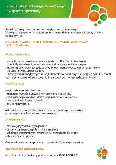 SPECJALISTY MARKETINGU TERENOWEGO / WSPARCIA SPRZEDAŻY (woj. dolnośląskie).